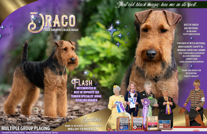 American Grand Champion Darwyn’s Black Magic, Draco, was awarded Best Opposite Sex (BOS) at the famous Westminster Kennel Club’s 150th show in New York.